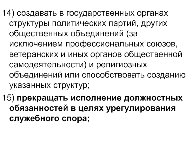 Слайд 8214) создавать в государственных органах структуры политических партий, других общественных