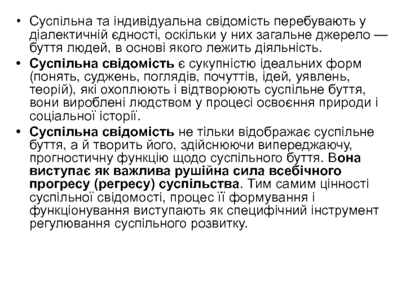 Слайд 20Суспільна та індивідуальна свідомість перебувають у діалектичній єдності, оскільки у
