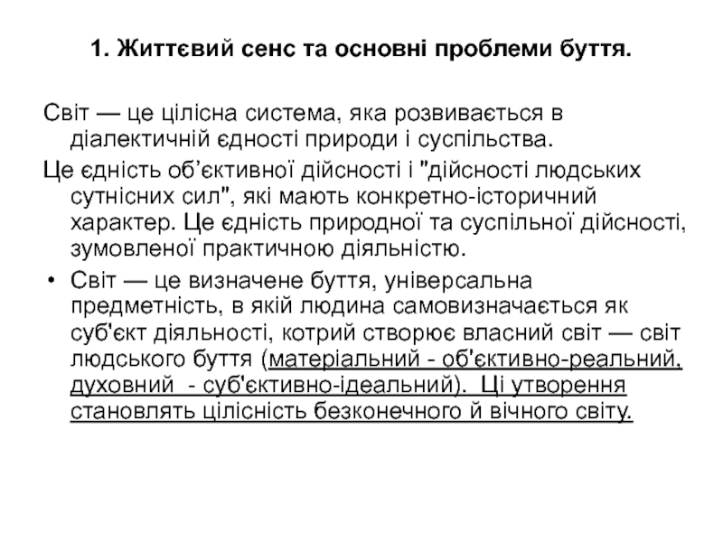 Світ — це визначене буття, універсальна предметність, в якій людина самовизначається як суб'єкт діяльності, котрий створює власний світ — світ людського буття (матеріальний - об'єктивно-реальний, духовний - суб'єктивно-ідеальний). Ці утворення становлять цілісність безконечного й вічного світу.