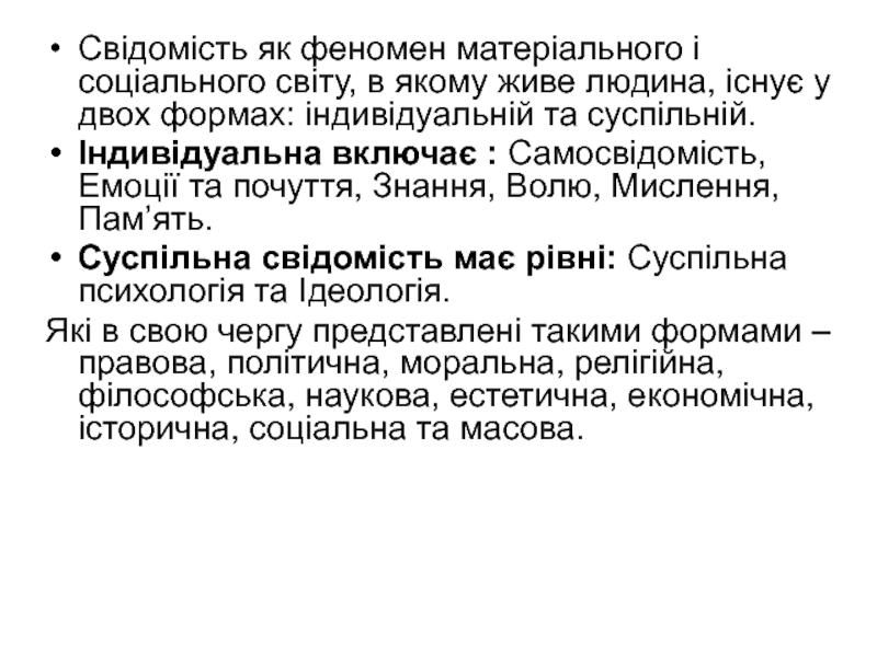 Слайд 19Свідомість як феномен матеріального і соціального світу, в якому живе