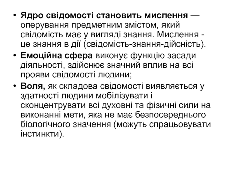 Слайд 18Ядро свідомості становить мислення — оперування предметним змістом, який свідомість