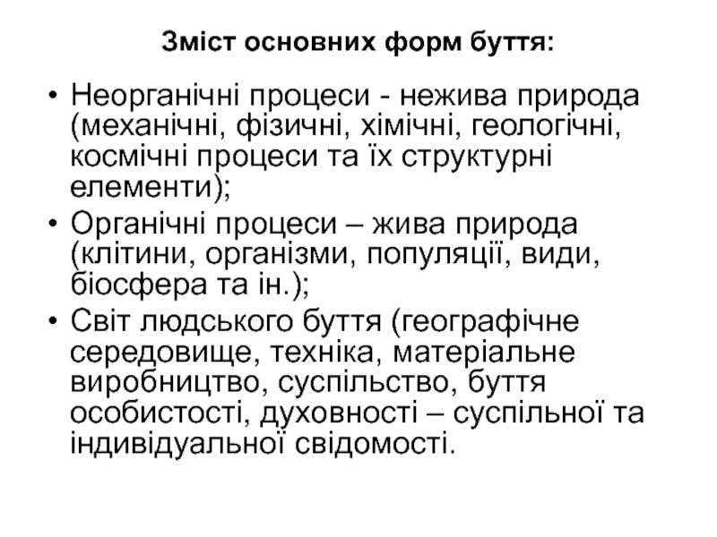 Світ людського буття (географічне середовище, техніка, матеріальне виробництво, суспільство, буття особистості, духовності – суспільної та індивідуальної свідомості.