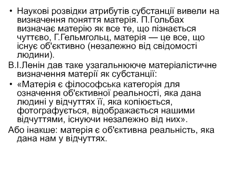 Слайд 8Наукові розвідки атрибутів субстанції вивели на визначення поняття матерія. П.Гольбах