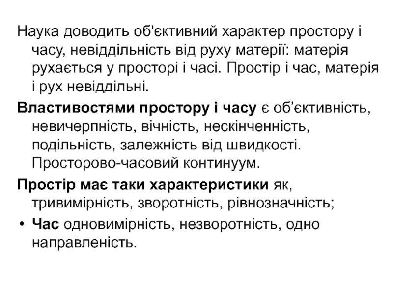 Властивостями простору і часу є об’єктивність, невичерпність, вічність, нескінченність, подільність, залежність від швидкості. Просторово-часовий континуум.