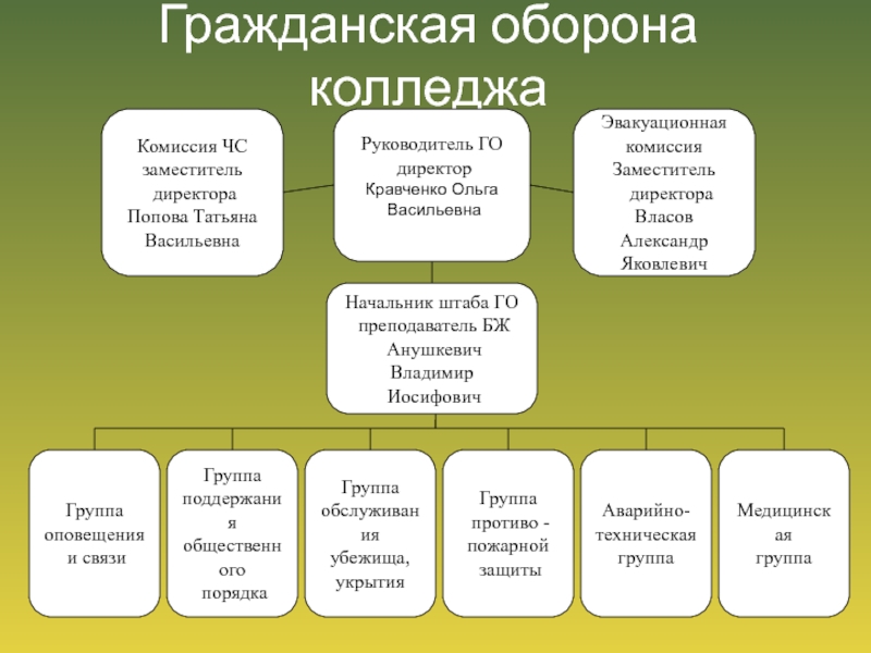 сотрудников колледжа правильно использовать средства коллективной (убежища) и индивидуальной (противогаз, средства защиты кожи ОЗК Л-1) защиты.3. Обучить население, студентов, сотрудников организованно и своевременно занимать защитные сооружения.
