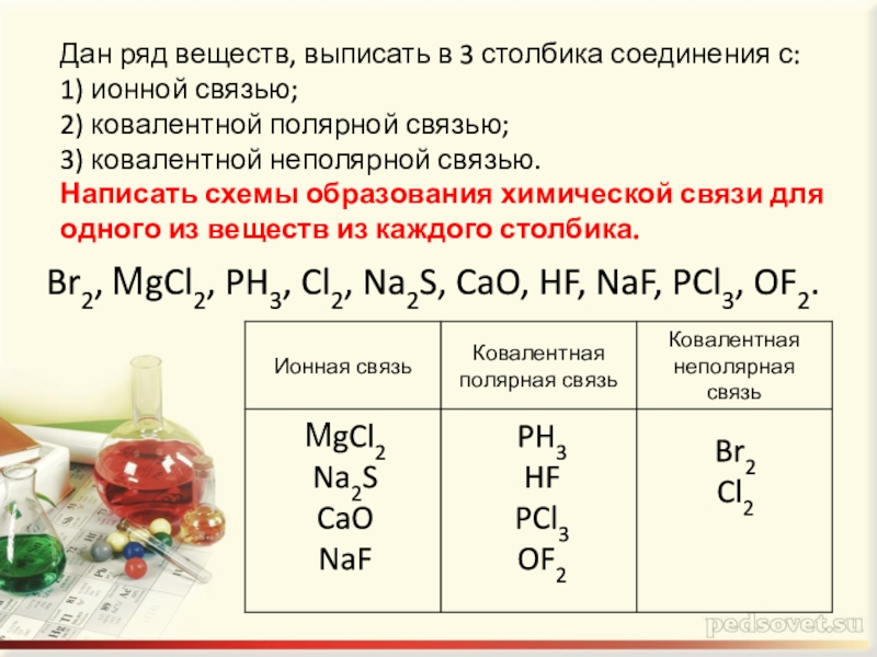 Br2, МgCl2, PH3, Cl2, Na2S, CaO, HF, NaF, PCl3, OF2.