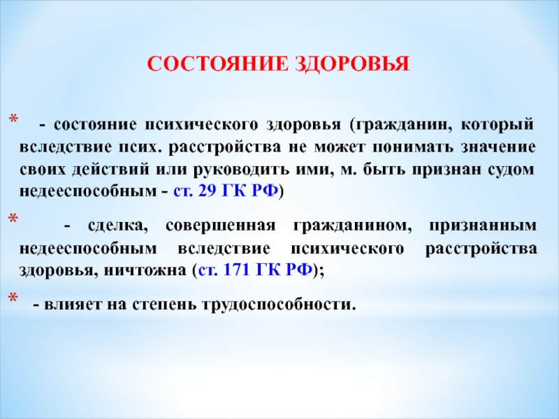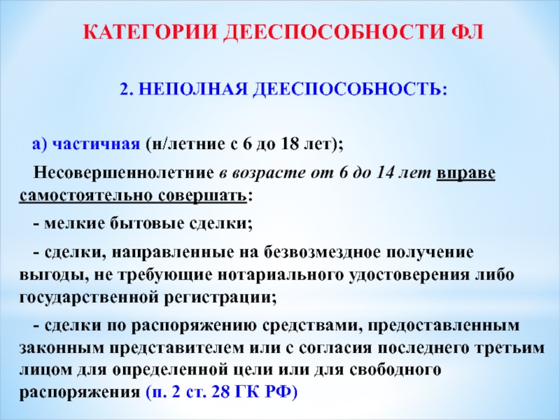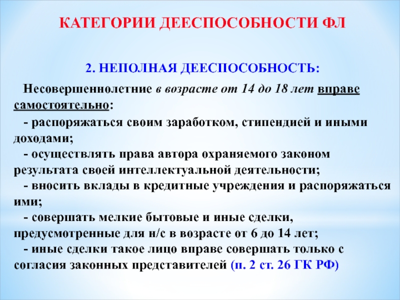 2. ДЕЕСПОСОБНОСТЬ - способность гражданина своими действиями приобретать и осуществлять гражданские права, создавать для себя гражданские обязанности и исполнять их