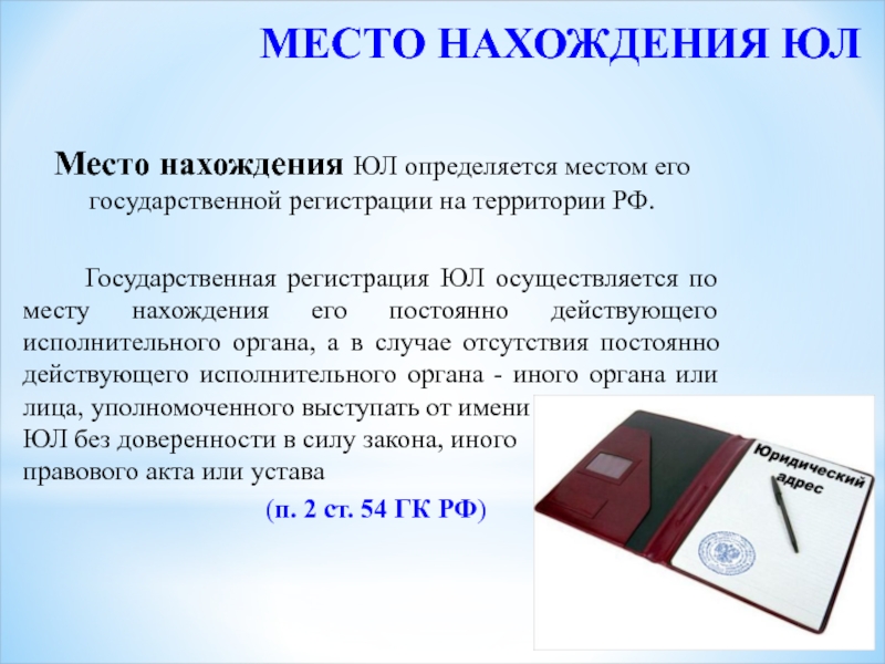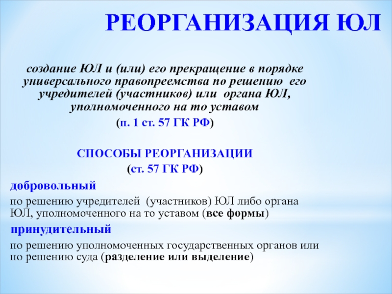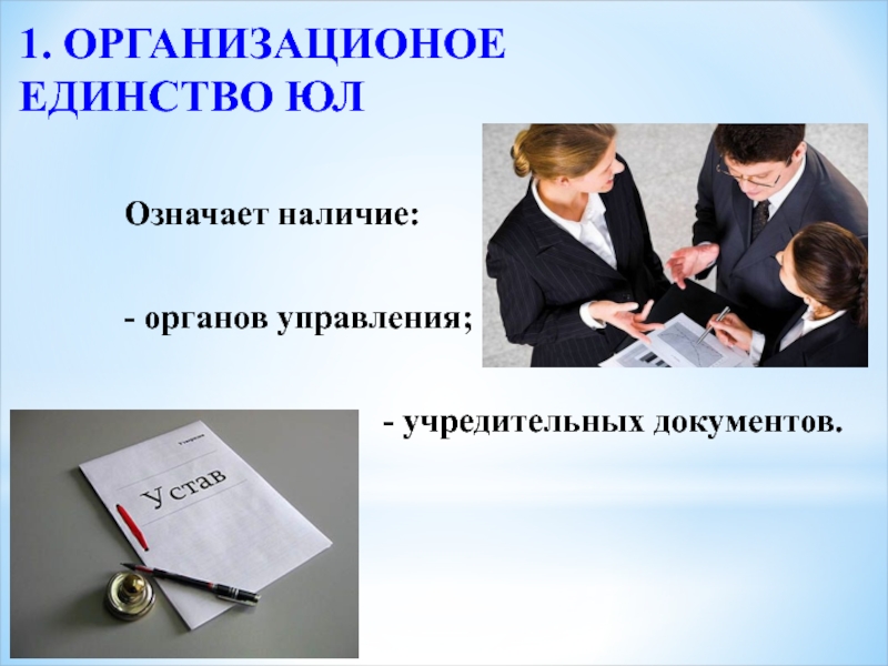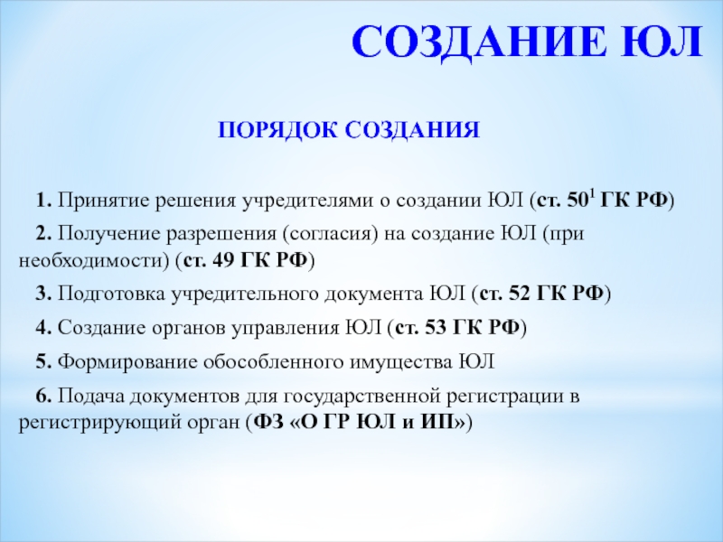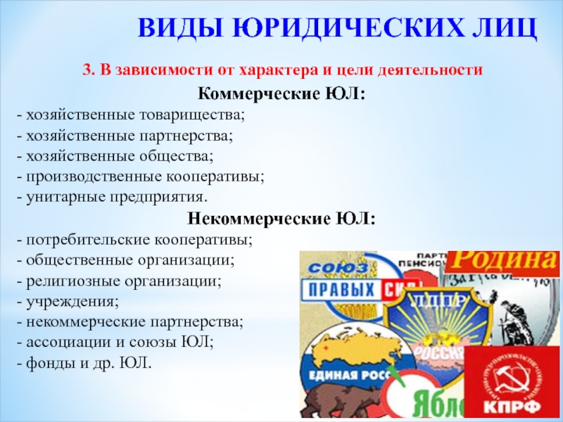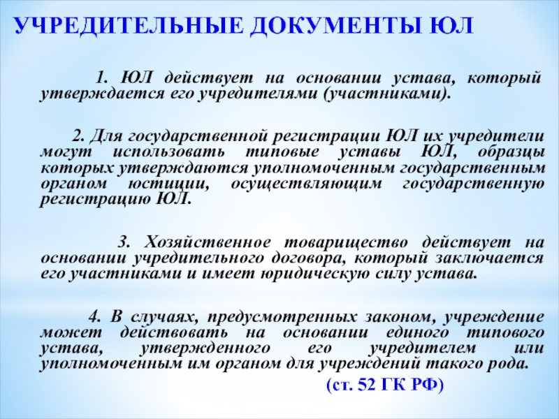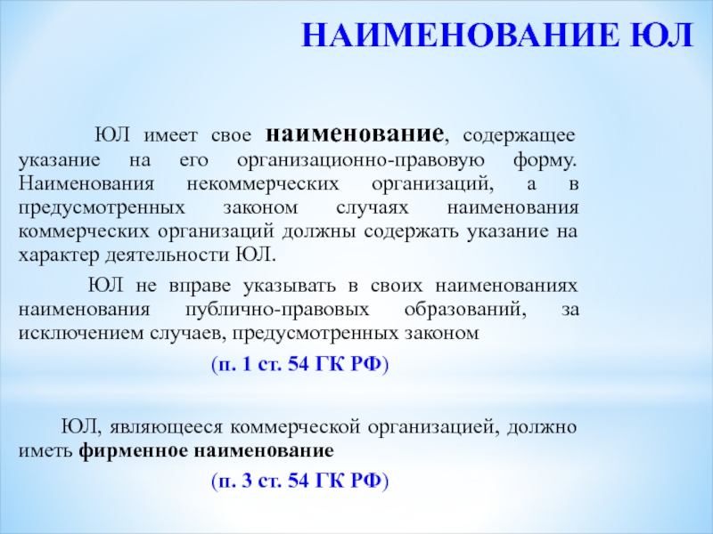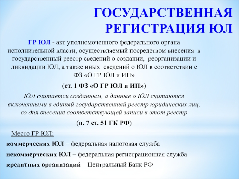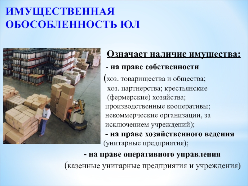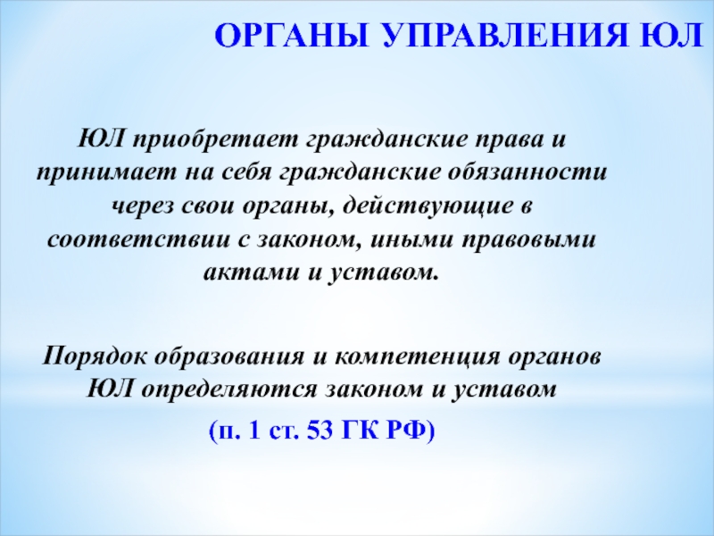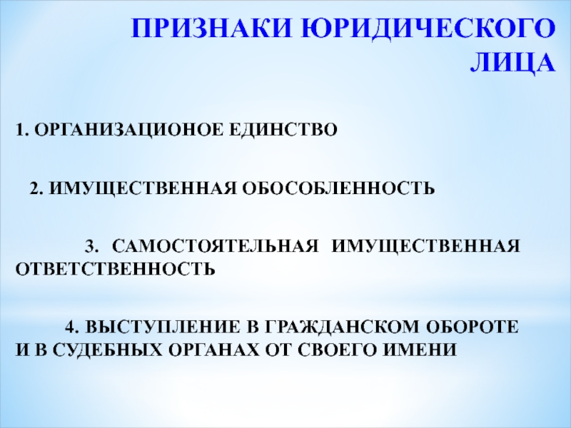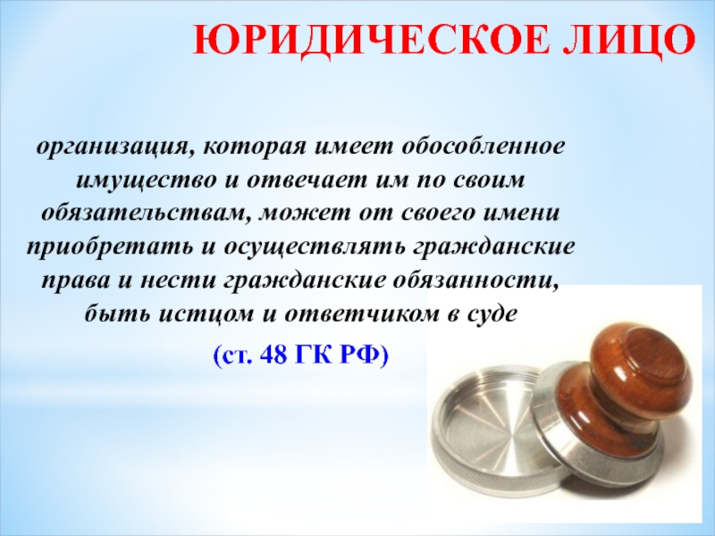 2. ЮРИДИЧЕСКИЕ ЛИЦА (ЮЛ) - организации, имеющие обособленное имущество и отвечающие по своим обязательствам этим имуществом, от своего имени приобретающие и осуществляющие имущественные и л/неимущественные права, исполняющие обязанности, выступающие истцом и ответчиком в суде, зарегистрированные в таком качестве в установленном законом порядке (ст. 48 ГК РФ)