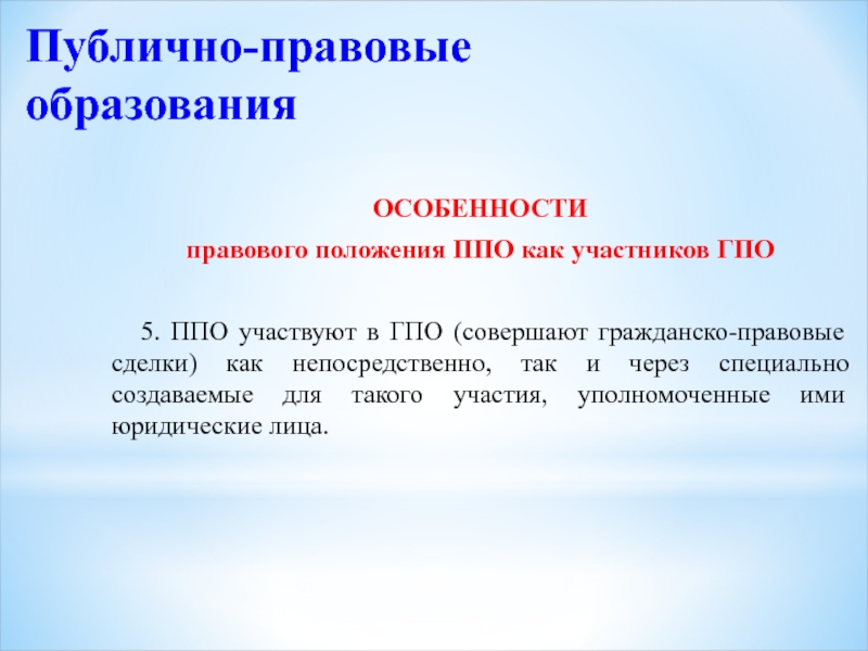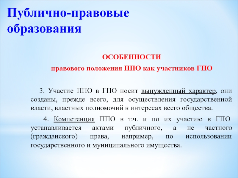 4. Компетенция ППО в т.ч. и по их участию в ГПО устанавливается актами публичного, а не частного (гражданского) права, например, по использовании государственного и муниципального имущества.