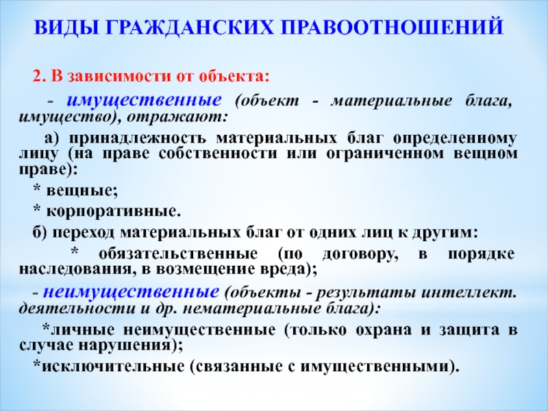 Слайд 6ВИДЫ ГРАЖДАНСКИХ ПРАВООТНОШЕНИЙ