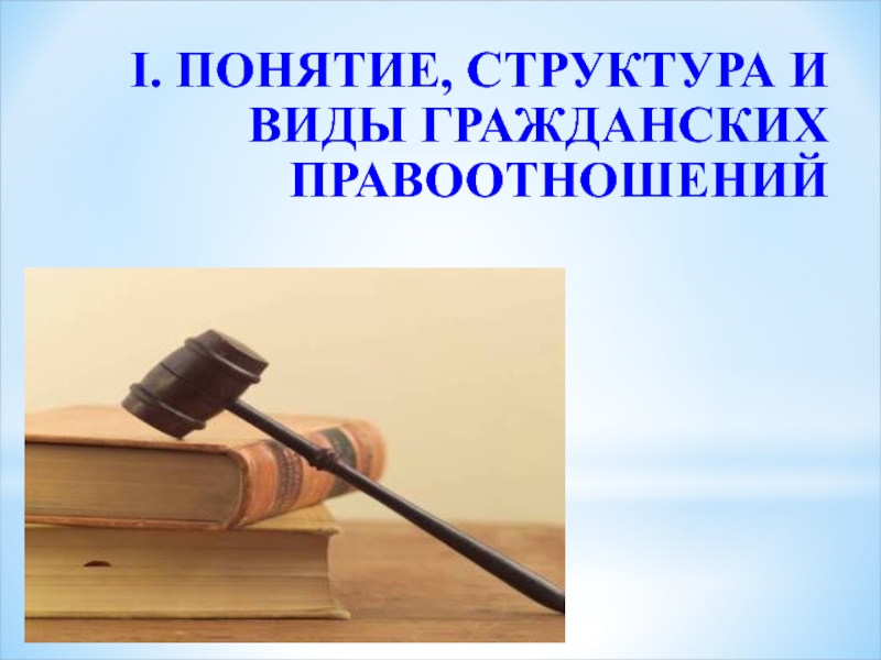 Слайд 2I. ПОНЯТИЕ, СТРУКТУРА И ВИДЫ ГРАЖДАНСКИХ ПРАВООТНОШЕНИЙ