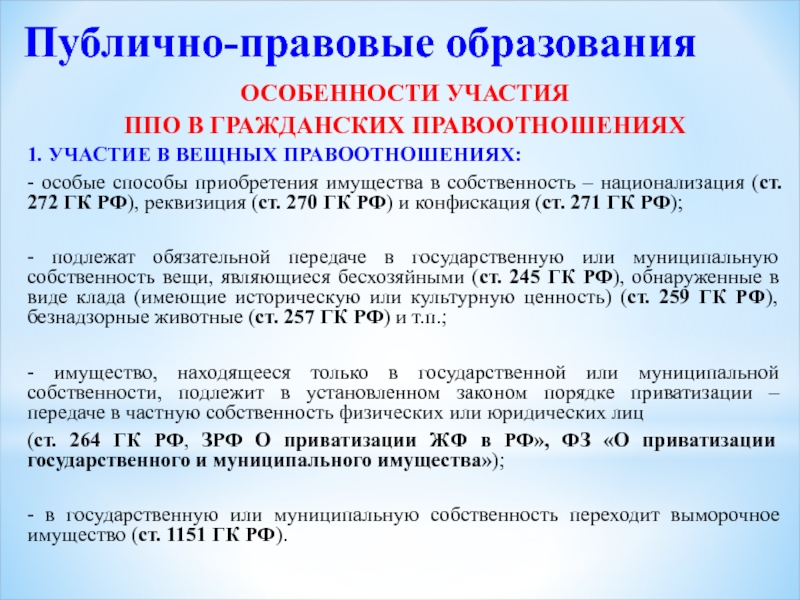 (ст. 264 ГК РФ, ЗРФ О приватизации ЖФ в РФ», ФЗ «О приватизации государственного и муниципального имущества»);