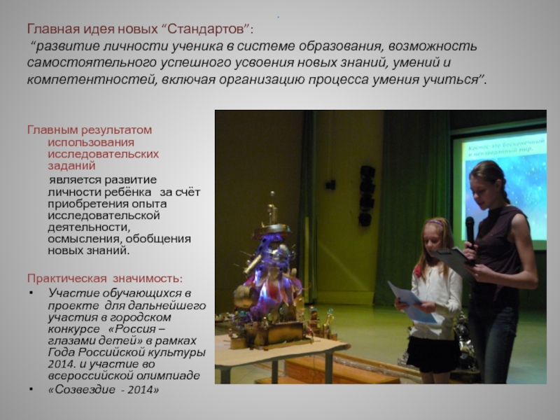 самоутверждение обучающихся благодаря достижению поставленной цели и получения результатов: выполненный проект и защита проекта на сцене с презентацией.