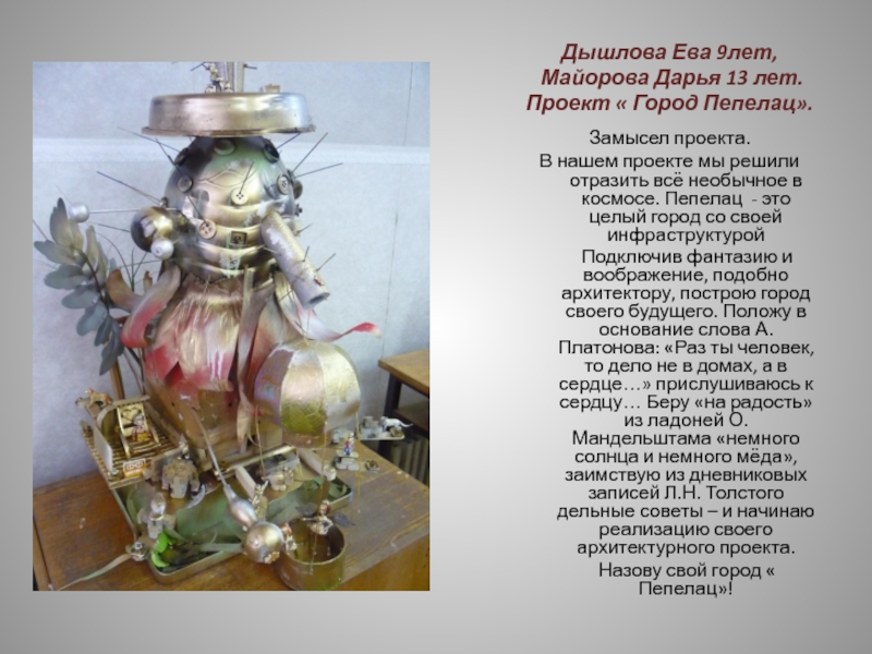 Подключив фантазию и воображение, подобно архитектору, построю город своего будущего. Положу в основание слова А. Платонова: «Раз ты человек, то дело не в домах, а в сердце…» прислушиваюсь к сердцу… Беру «на радость» из ладоней О. Мандельштама «немного солнца и немного мёда», заимствую из дневниковых записей Л.Н. Толстого дельные советы – и начинаю реализацию своего архитектурного проекта.