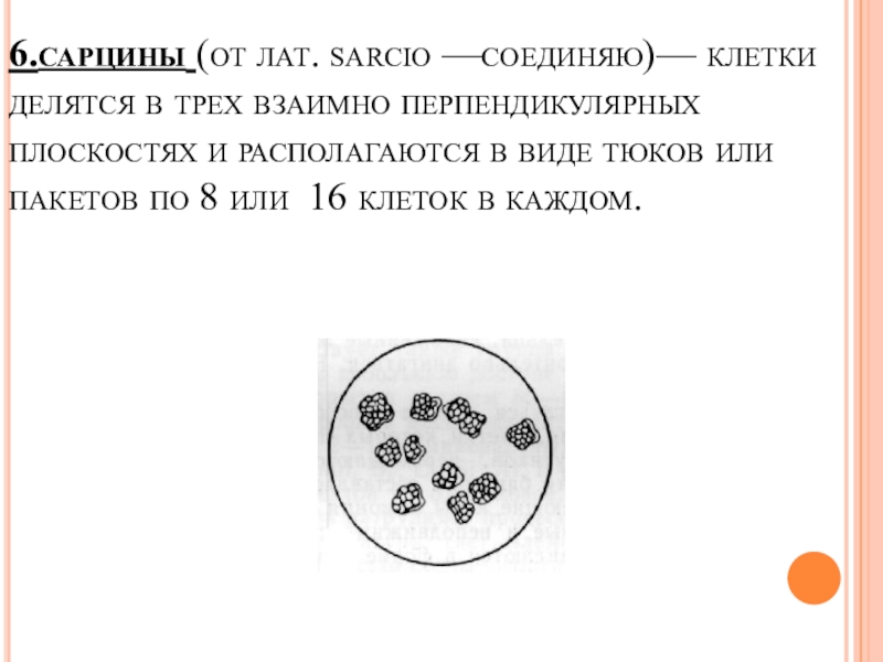 6.сарцины (от лат. sarcio —соединяю)— клетки делятся в трех взаимно