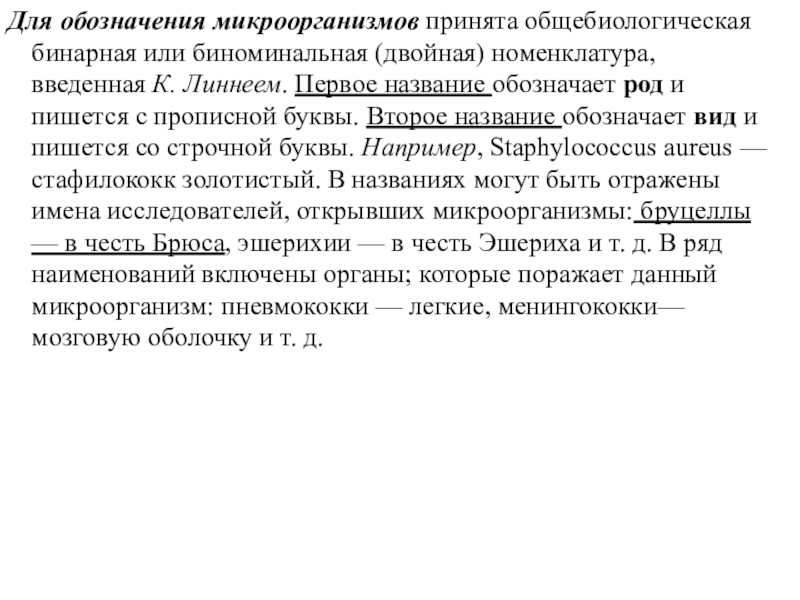 прописной буквы. Второе название обозначает вид и пишется со строчной буквы. Например, Staphylococcus aureus — стафилококк золотистый. В названиях могут быть отражены имена исследователей, открывших микроорганизмы: бруцеллы — в честь Брюса, эшерихии — в честь Эшериха и т. д. В ряд наименований включены органы; которые поражает данный микроорганизм: пневмококки — легкие, менингококки— мозговую оболочку и т. д.