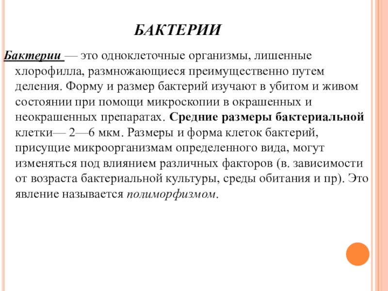 состоянии при помощи микроскопии в окрашенных и неокрашенных препаратах. Средние размеры бактериальной клетки— 2—6 мкм. Размеры и форма клеток бактерий, присущие микроорганизмам определенного вида, могут изменяться под влиянием различных факторов (в. зависимости от возраста бактериальной культуры, среды обитания и пр). Это явление называется полиморфизмом.
