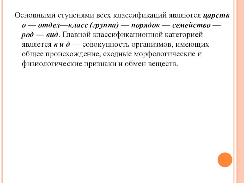 — порядок — семейство —род — вид. Главной классификационной категорией