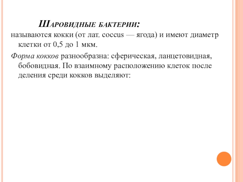 сферическая, ланцетовидная, бобовидная. По взаимному расположению клеток после деления среди кокков выделяют: