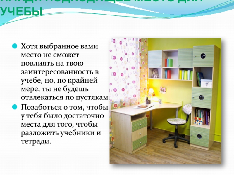 Позаботься о том, чтобы у тебя было достаточно места для того, чтобы разложить учебники и тетради.