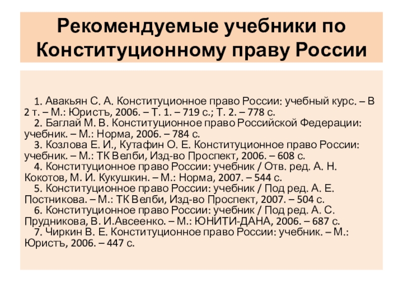 1. – 719 с.; Т. 2. – 778 с.     2. Баглай М. В. Конституционное право Российской Федерации: учебник. – М.: Норма, 2006. – 784 с.     3. Козлова Е. И., Кутафин О. Е. Конституционное право России: учебник. – М.: ТК Велби, Изд-во Проспект, 2006. – 608 с.     4. Конституционное право России: учебник / Отв. ред. А. Н. Кокотов, М. И. Кукушкин. – М.: Норма, 2007. – 544 с.     5. Конституционное право России: учебник / Под ред. А. Е.Постникова. – М.: ТК Велби, Изд-во Проспект, 2007. – 504 с.     6. Конституционное право России: учебник / Под ред. А. С.Прудникова, В. И.Авсеенко. – М.: ЮНИТИ-ДАНА, 2006. – 687 с.     7. Чиркин В. Е. Конституционное право России: учебник. – М.: Юристъ, 2006. – 447 с.