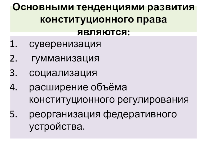Основными тенденциями развития конституционного права являются: суверенизация гумманизация социализация расширение объёма конституционного регулирования реорганизация федеративного устройства.