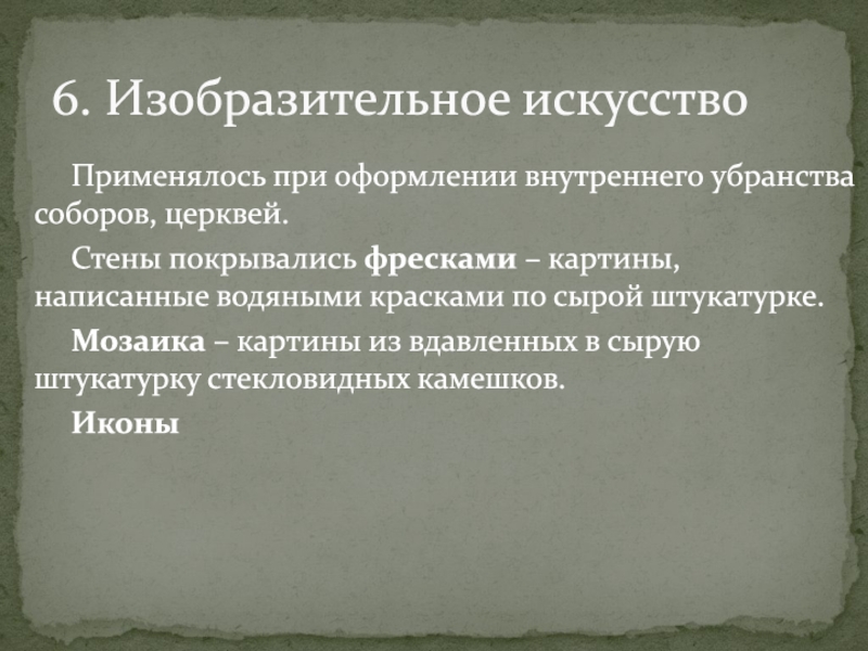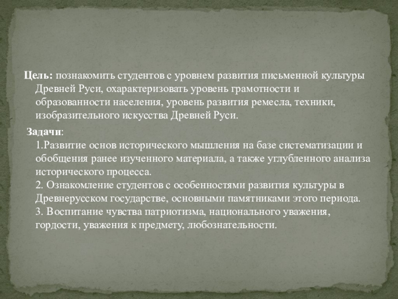 изобразительного искусства Древней Руси.Задачи: 1.Развитие основ исторического мышления на базе систематизации и обобщения ранее изученного материала, а также углубленного анализа исторического процесса. 2. Ознакомление студентов с особенностями развития культуры в Древнерусском государстве, основными памятниками этого периода. 3. Воспитание чувства патриотизма, национального уважения, гордости, уважения к предмету, любознательности.