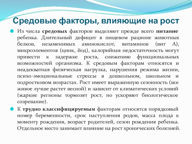 незаменимых аминокислот, витаминов (вит А), микроэлементов (цинк, йод), калорийная недостаточность могут привести к задержке роста, снижению функциональных возможностей организма. К средовым факторам относятся и неадекватная физическая нагрузка, нарушения режима жизни, психо-эмоциональные стрессы в дошкольном, школьном и подростковом возрастах. Рост имеет выраженную сезонность (все живое лучше растет весной) и зависит от климатических условий (жаркие регионы тормозят рост, но ускоряют биологическое созревание).