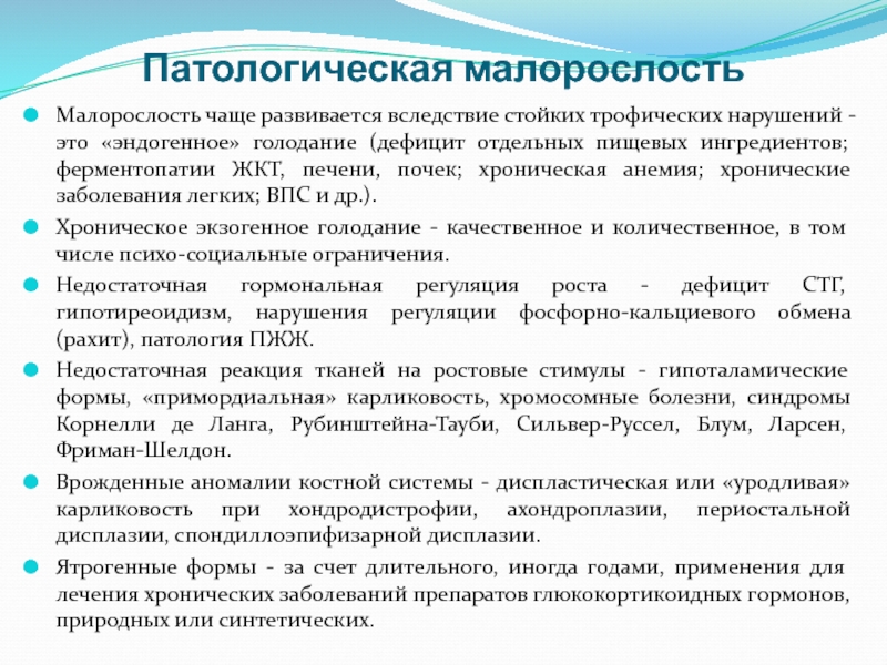 Недостаточная реакция тканей на ростовые стимулы - гипоталамические формы, «примордиальная» карликовость, хромосомные болезни, синдромы Корнелли де Ланга, Рубинштейна-Тауби, Сильвер-Руссел, Блум, Ларсен, Фриман-Шелдон.