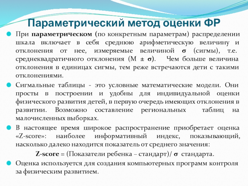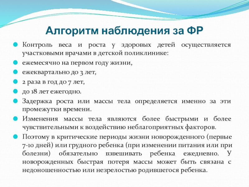 Хронические заболевания, вызывающие расстройства ФР детей, сопровождаются относительно медленными изменениями массы или роста в сравнении с центильными или сигмальными стандартами.