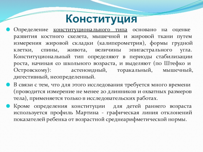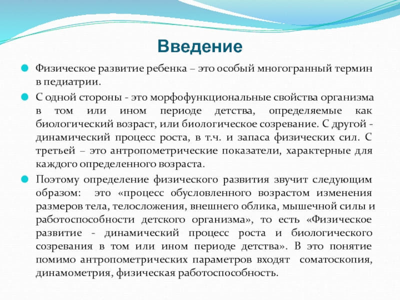 Поэтому определение физического развития звучит следующим образом: это «процесс обусловленного возрастом изменения размеров тела, телосложения, внешнего облика, мышечной силы и работоспособности детского организма», то есть «Физическое развитие - динамический процесс роста и биологического созревания в том или ином периоде детства». В это понятие помимо антропометрических параметров входят соматоскопия, динамометрия, физическая работоспособность.