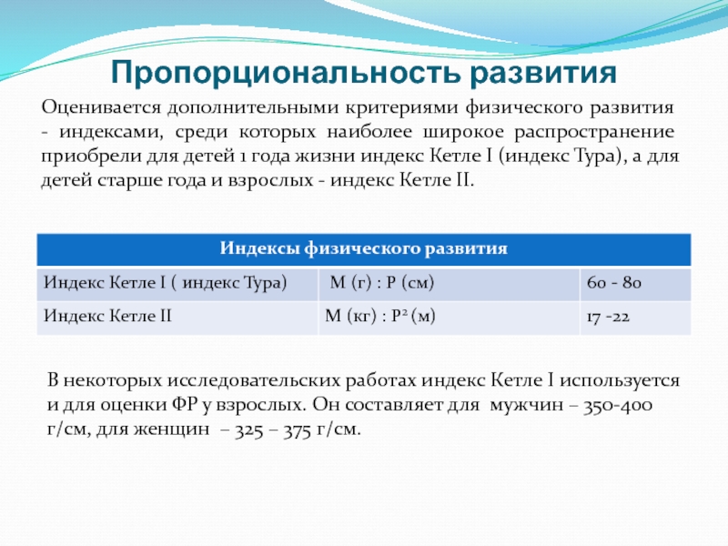 К основным антропометрическим показателям ФР относят рост, массу, окружности грудной клетки и головы (для детей до 5 лет жизни). Рост (длина тела) является генетически детерминированным, наиболее устойчивым показателем по сравнению с более лабильными показателями массы и окружности груди. Уровень физического развития определяется именно ростом ребенка.