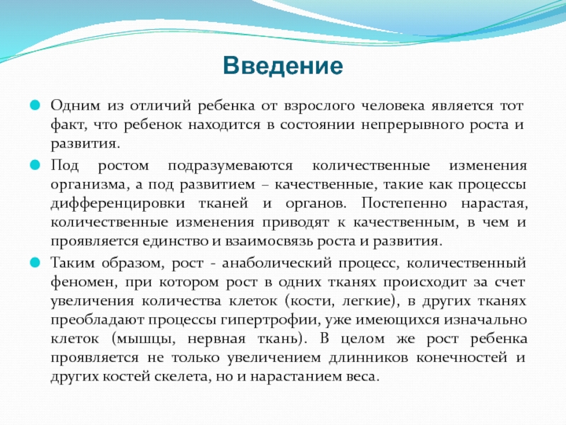 Таким образом, рост - анаболический процесс, количественный феномен, при котором рост в одних тканях происходит за счет увеличения количества клеток (кости, легкие), в других тканях преобладают процессы гипертрофии, уже имеющихся изначально клеток (мышцы, нервная ткань). В целом же рост ребенка проявляется не только увеличением длинников конечностей и других костей скелета, но и нарастанием веса.