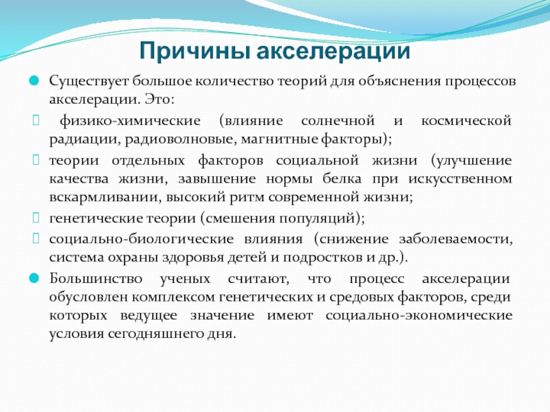 Большинство ученых считают, что процесс акселерации обусловлен комплексом генетических и средовых факторов, среди которых ведущее значение имеют социально-экономические условия сегодняшнего дня.