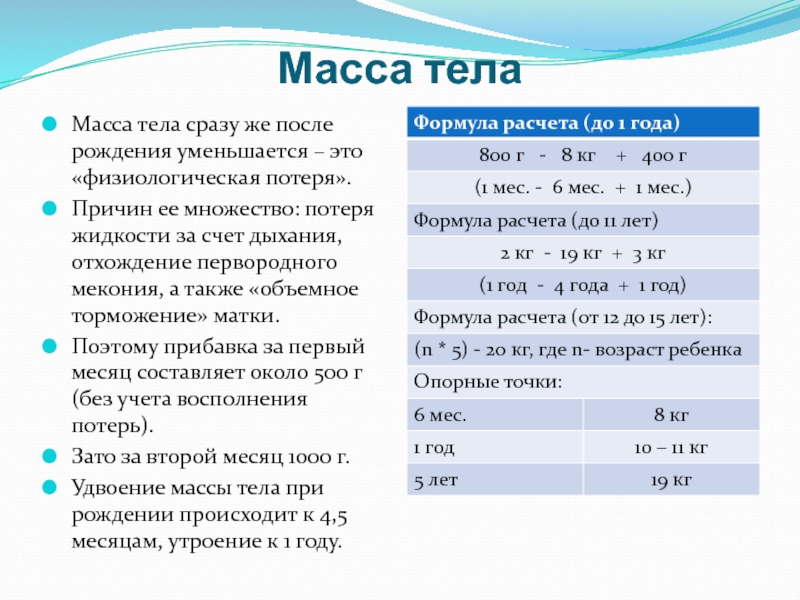 тела относительно роста свидетельствует о недостаточности питания или гипотрофии (1 год жизни).