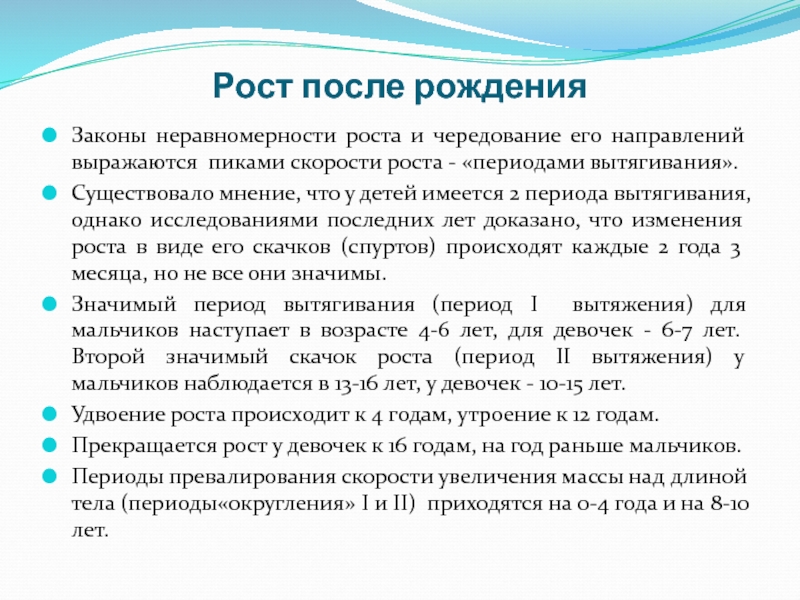 Неравномерность изменений скорости роста (ускорение роста вскоре после рождения, «препубертатный скачок» после 11-12 лет, «полуростовой скачок» в возрасте от 5 до 8 лет). Асинхронный рост скелета и отдельных его частей и органов: череп, мозг, лимфоидная ткань и репродуктивные органы.