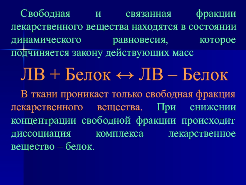 Слайд 10Свободная и связанная фракции лекарственного вещества находятся в состоянии динамического
