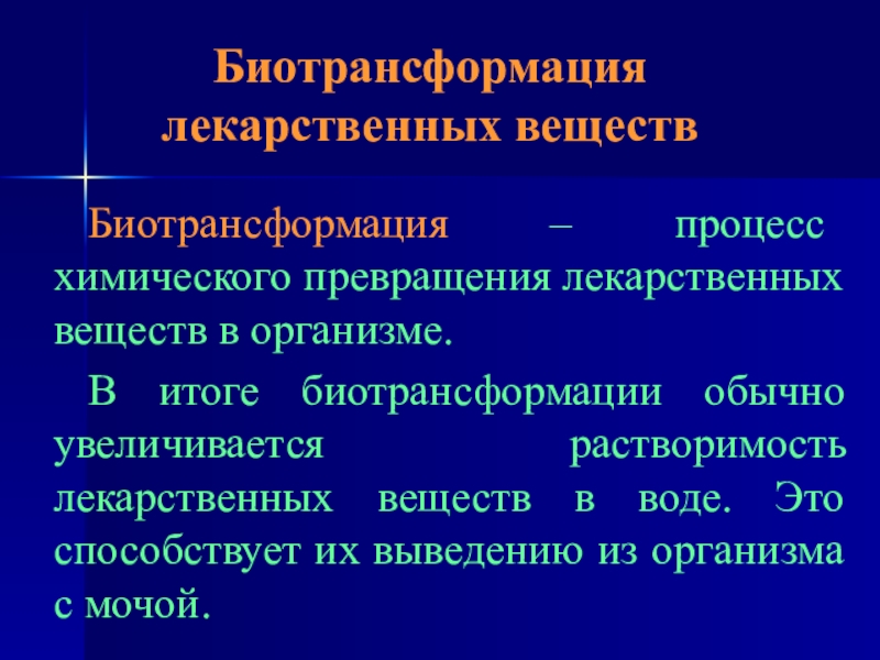 В итоге биотрансформации обычно увеличивается растворимость лекарственных веществ в воде.