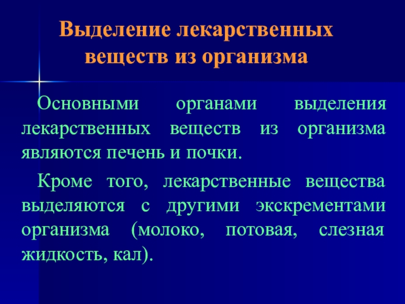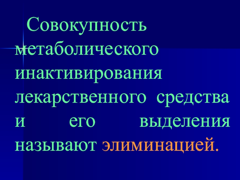 Слайд 23Совокупность метаболического инактивирования лекарственного средства и его выделения называют элиминацией.