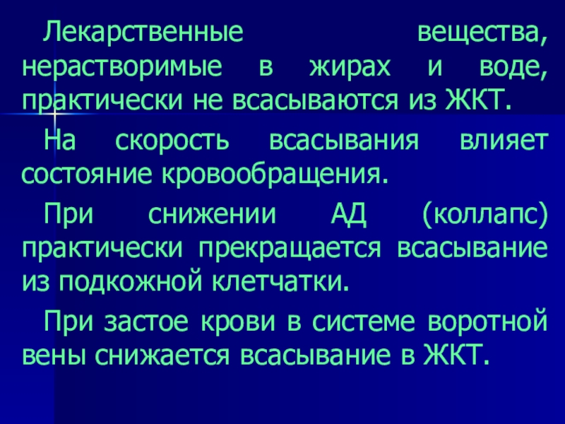 Слайд 7Лекарственные вещества, нерастворимые в жирах и воде, практически не всасываются