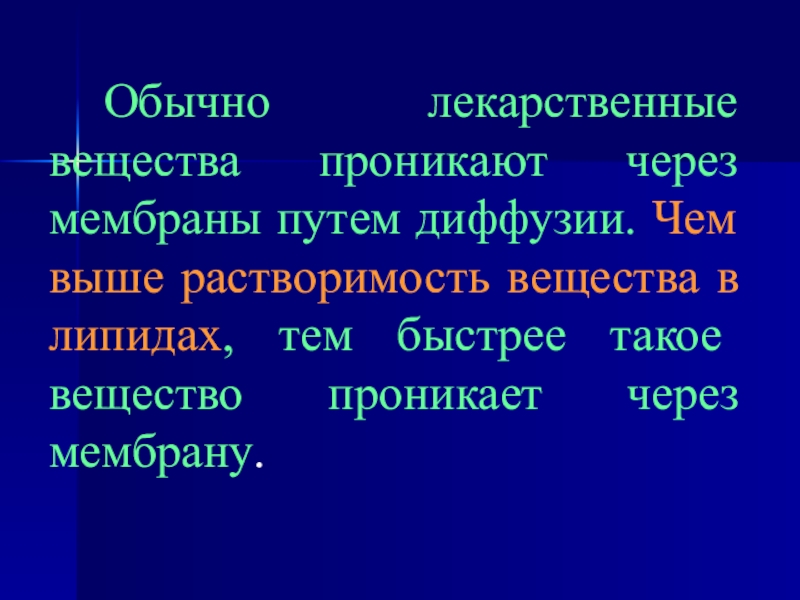 Слайд 4Обычно лекарственные вещества проникают через мембраны путем диффузии. Чем выше