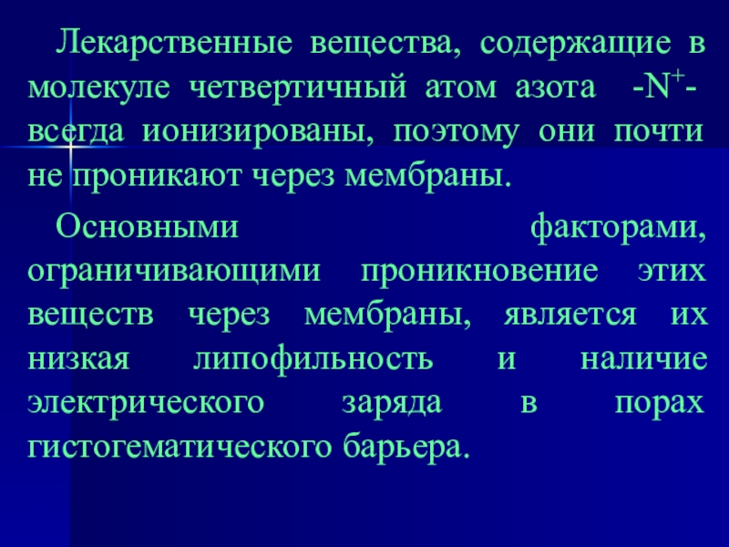 проникновение этих веществ через мембраны, является их низкая липофильность и наличие электрического заряда в порах гистогематического барьера.