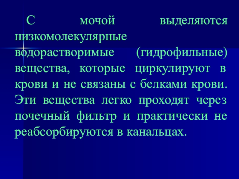 Слайд 24С мочой выделяются низкомолекулярные водорастворимые (гидрофильные) вещества, которые циркулируют в