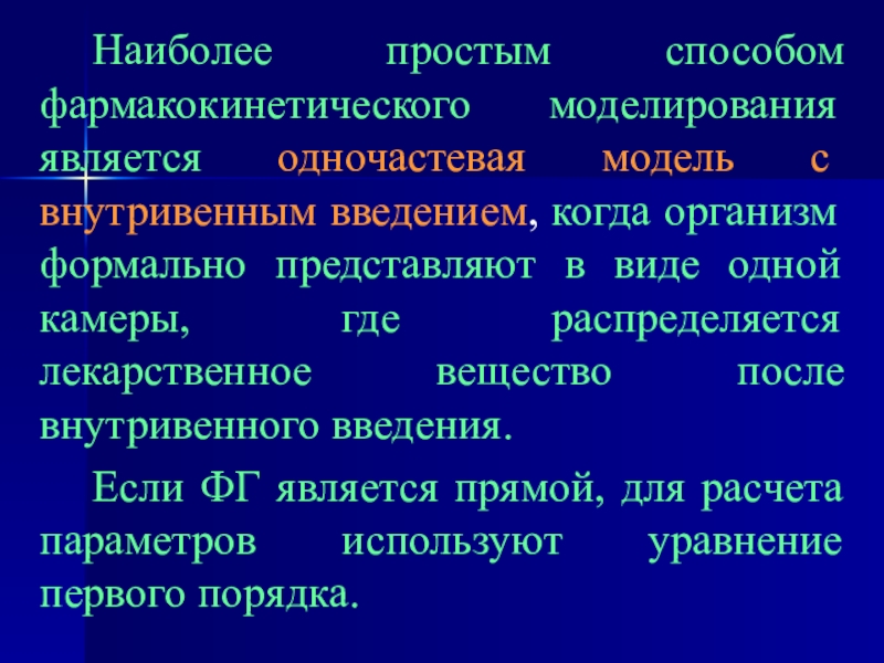 Слайд 30Наиболее простым способом фармакокинетического моделирования является одночастевая модель с внутривенным