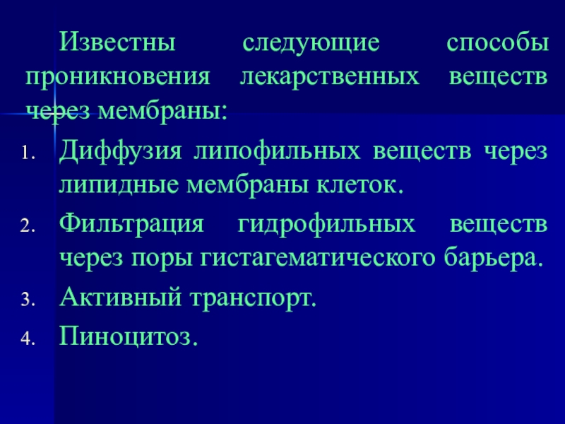 Слайд 3Известны следующие способы проникновения лекарственных веществ через мембраны: