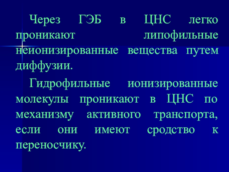 Слайд 13Через ГЭБ в ЦНС легко проникают липофильные неионизированные вещества путем