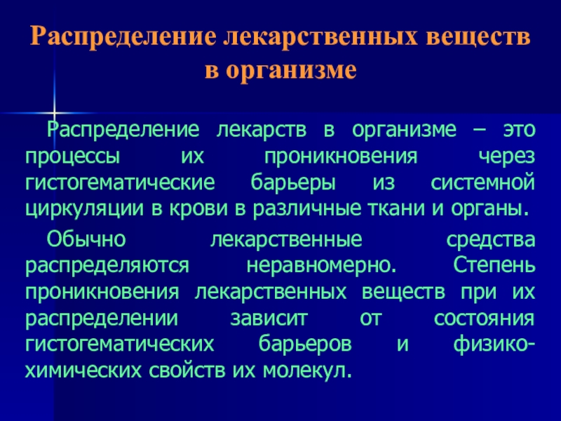 Обычно лекарственные средства распределяются неравномерно. Степень проникновения лекарственных веществ при их распределении зависит от состояния гистогематических барьеров и физико-химических свойств их молекул.