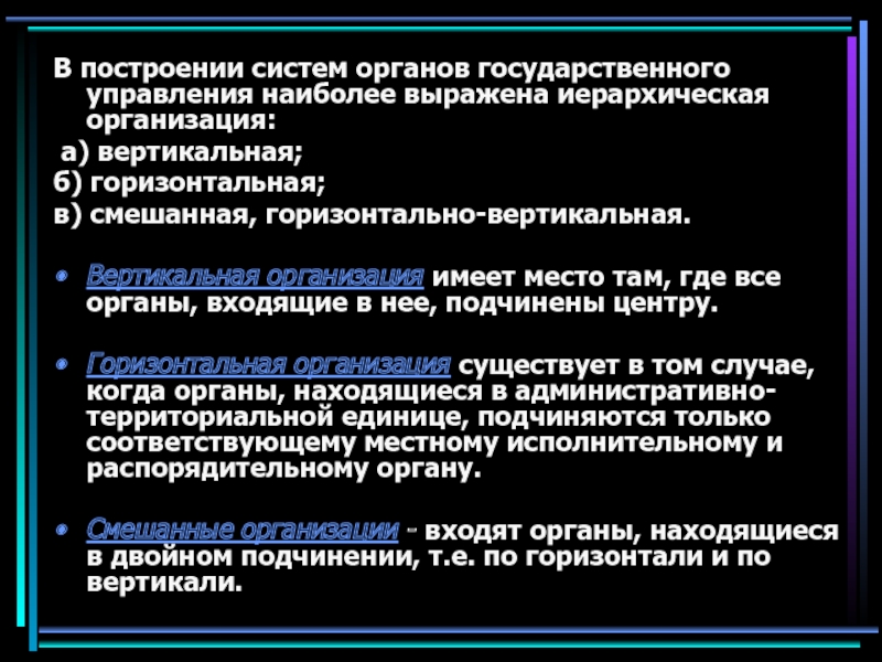 Слайд 9В построении систем органов государственного управления наиболее выражена иерархическая организация: