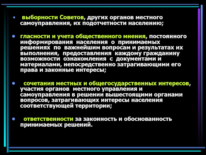 Слайд 21 выборности Советов, других органов местного самоуправления, их подотчетности населению;