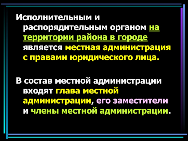 Слайд 24Исполнительным и распорядительным органом на территории района в городе является